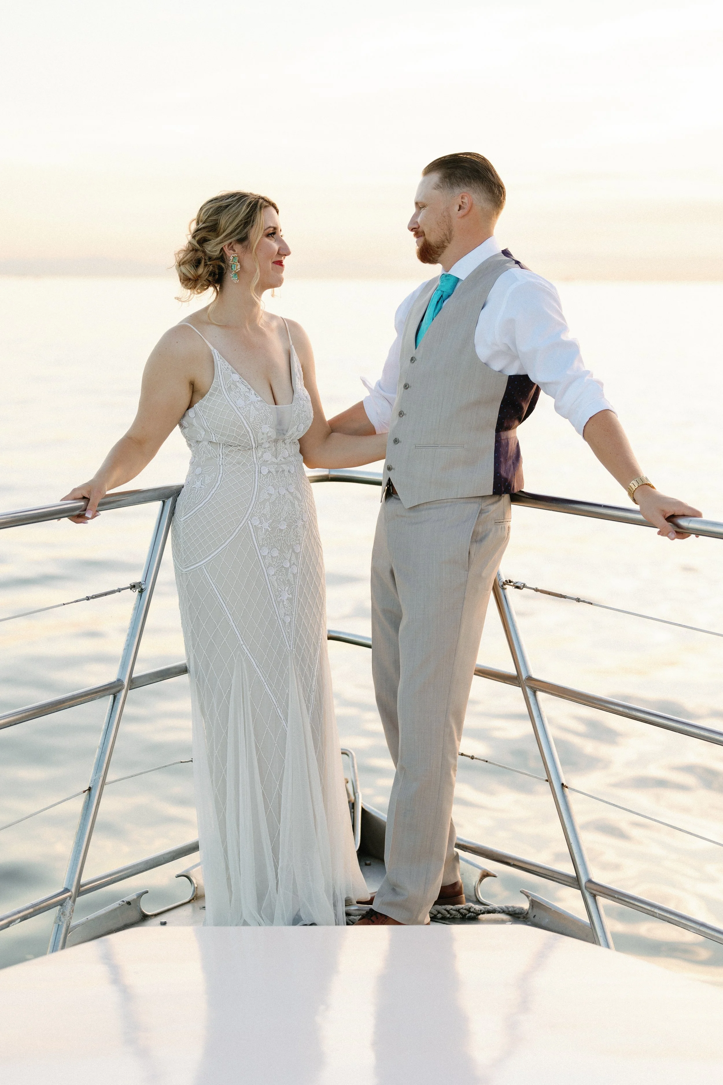 The day transitioned seamlessly from day to night, offering an array of photo opportunities that showcased the versatility of the stunning Vancouver backdrop. As the sun dipped below the horizon, casting a warm golden hue over the surroundings, the deck of the yacht transformed into a magical space for golden hour photos. Lisa and Tim, surrounded by their loved ones, enjoyed the breathtaking views of Mount Baker bathed in the soft glow of the setting sun.